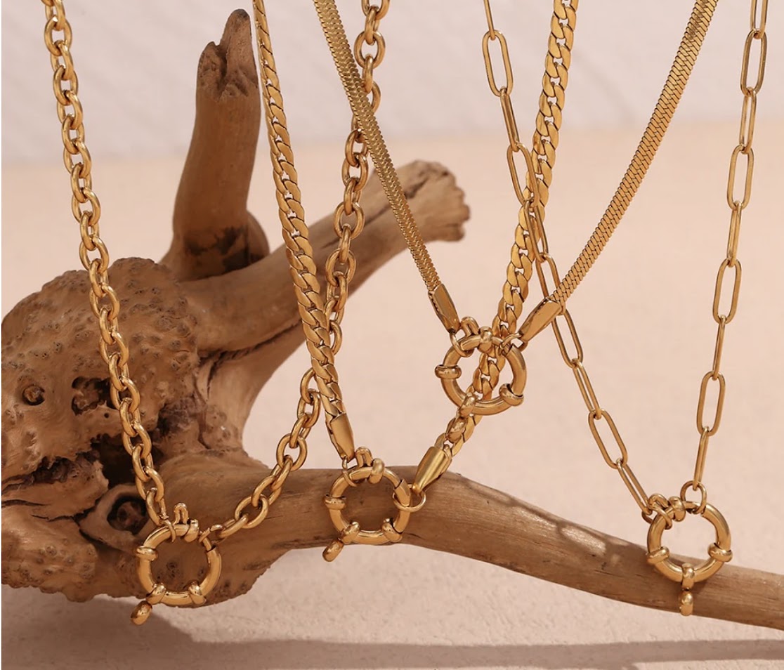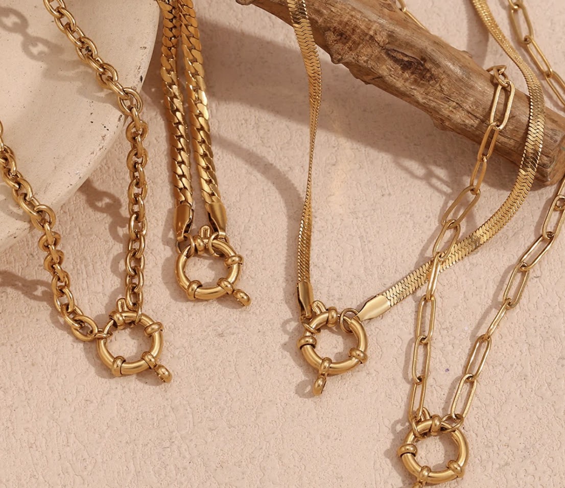 Elevate your style with our Gold-Plated Sailor Lock Necklaces. Each necklace is meticulously crafted with gold plating and available in four unique chain styles: Paperclip chain, Cuban chain, O-shaped chain, and Snake chain.